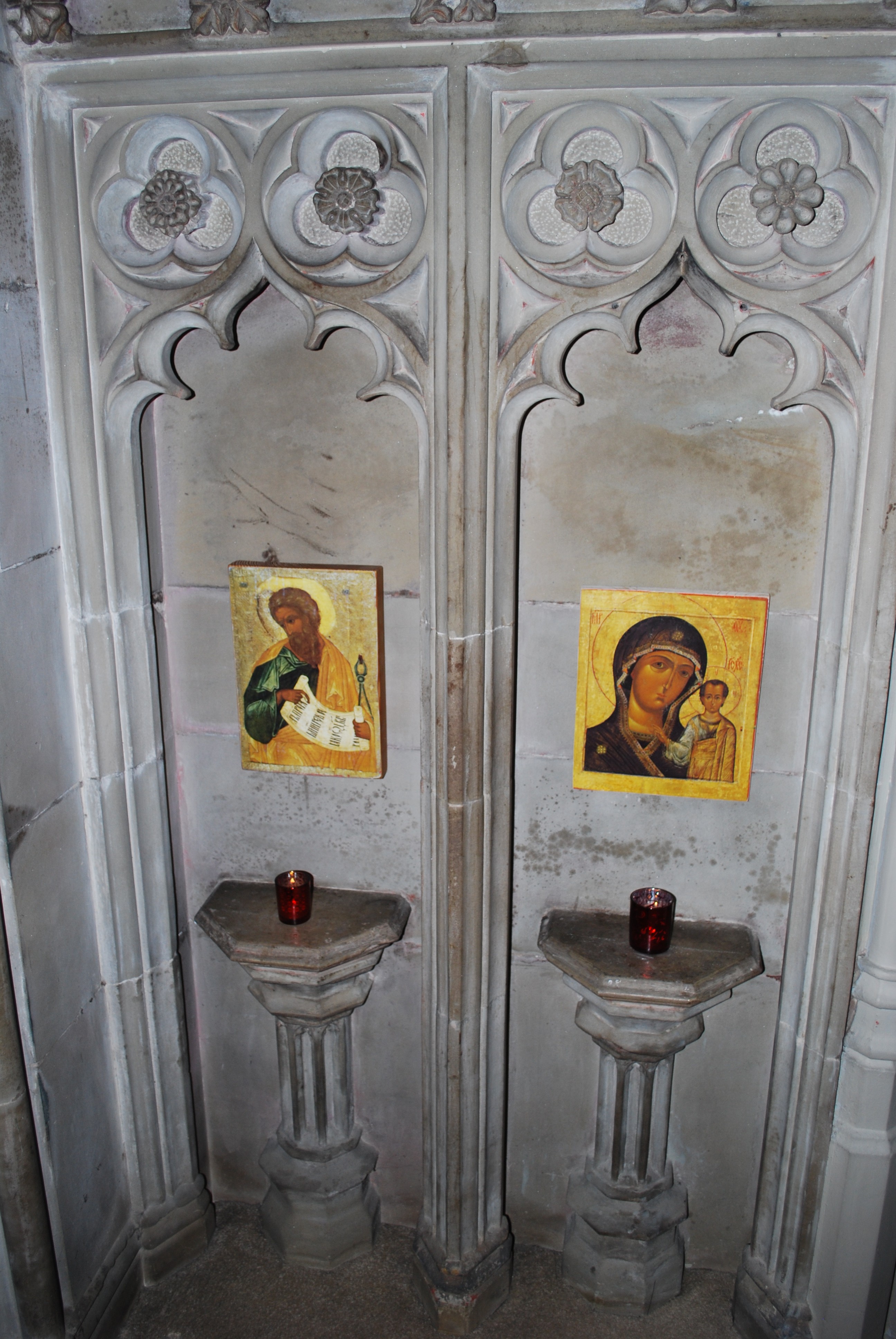 While most icons have their origin in the East, we should remember that they date from the time when the whole of Christendom was eastern in character, before the growth of the western, Roman, Church.ย Hence the writing on these images is usually in Greek or Cyrillic script. We have four reproductions of icons in the sanctuary.ย These represent the three angelic visitors to Abraham (the Old Testament Trinity), The Prophet Isaiah, St. John the Baptist and Our Lady.