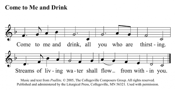 The Collegeville Composers were faced with attempting to provide for both the Vigil and the Mass of the Day. In this case, they drew inspiration from the Vigil Gospel, John 7:37-39: