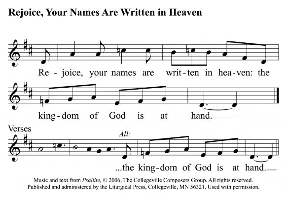 Today’s antiphon grafts together two verses from the Gospel of the day, Luke 10:20 and 10:11. The verses are from Psalm 40, with its theme of placing our trust in the Lord, as suggested in the 1998 ICEL Antiphonal.